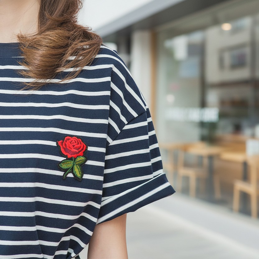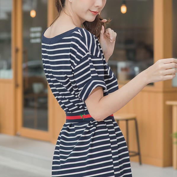 เติมลุคสตรีทกันหน่อย กับเดรสผ้ายืดลายริ้วทรง oversize ผ้ายืดเนื้อดีคะ ดีเทลปักลายกุหลาบที่หน้าอก เหมาะสำหรับสาวที่รักความสบาย ตัวเดียวก็เอาอยู่ แถมได้ควาชิคไปอีก เพิ่มความเกร๋ด้วยเข็มขัดปักลายกุหลาบทั้งเส้น ไม่ควรพลาดอย่างแรงส์