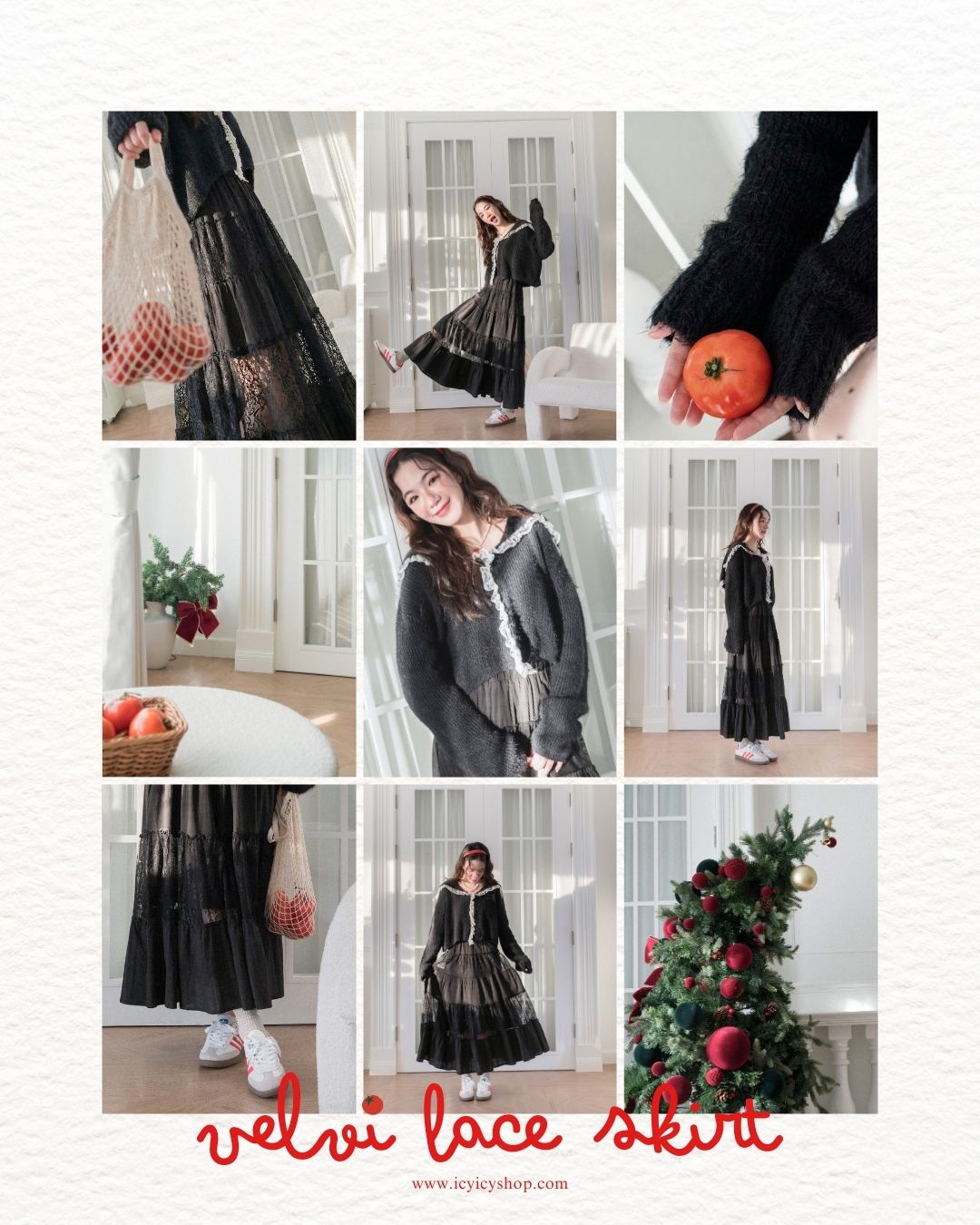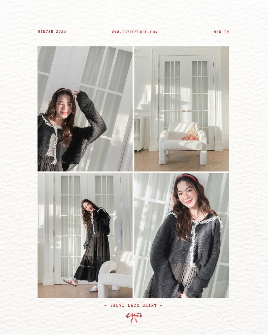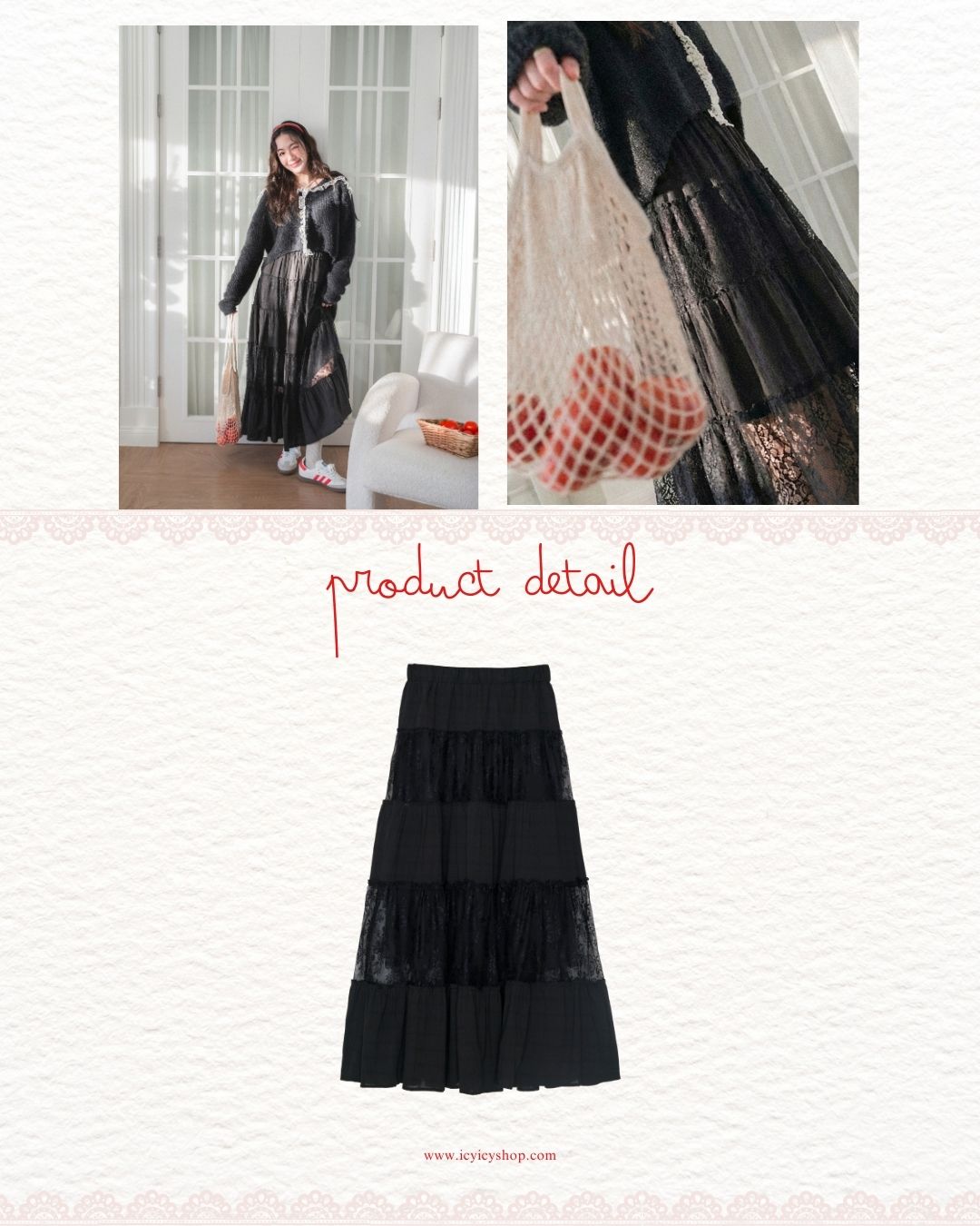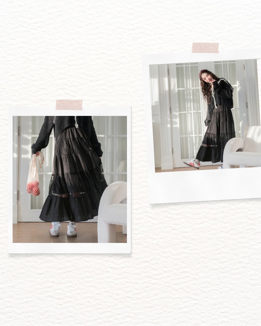 กระโปรง Maxi ตัดต่อผ้า cotton texture มีลวดลายในตัว ตัดต่อผ้าลูกไม้นิ่มๆ โทนเข้มที่มีความหรูและโรแมนติกในเวลาเดียวกัน ลูกไม้ลายละเอียด ฟูเบา มีมิติ ใส่แล้วดูสวยเพรียวและขาเรียวทรงเอวสูงเก็บส่วนเกินได้ดี ซับในสองชั้นไม่บาง ไม่โป๊ เอวยางยืดได้เยอะ เหมาะกับงานเย็น ดินเนอร์ หรือวันที่ต้องการลุคหวานแบบ grown-up