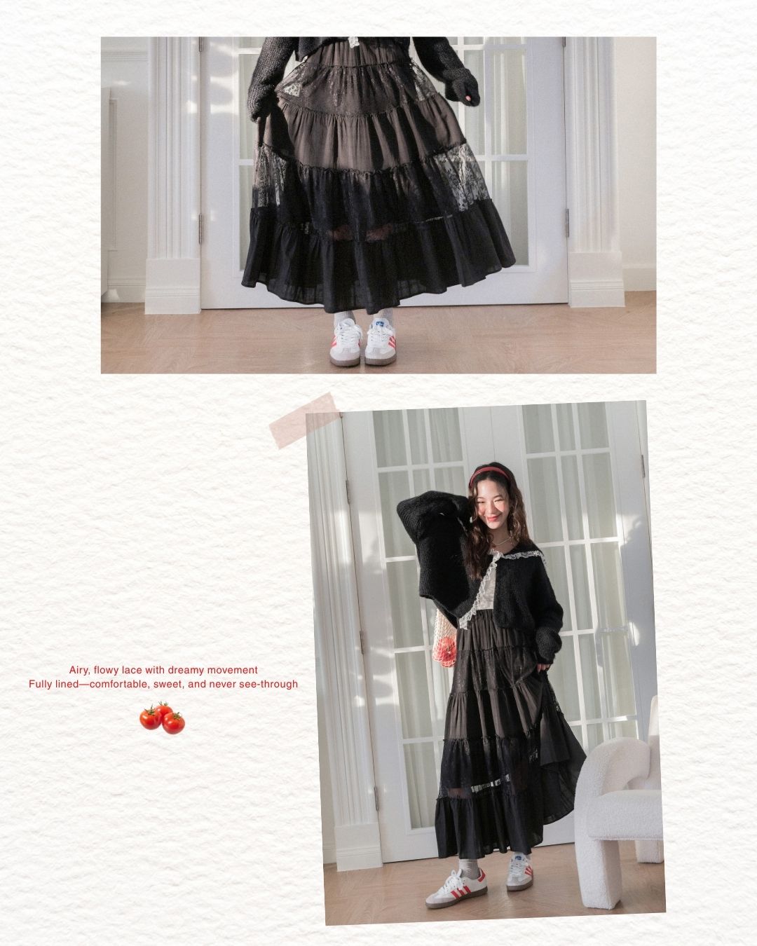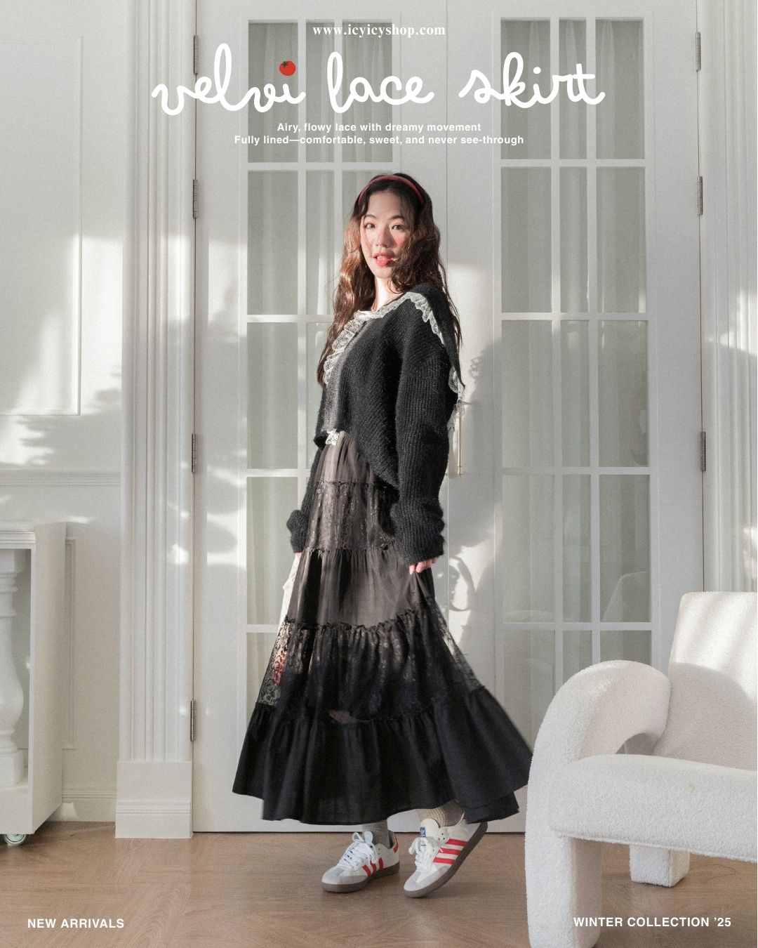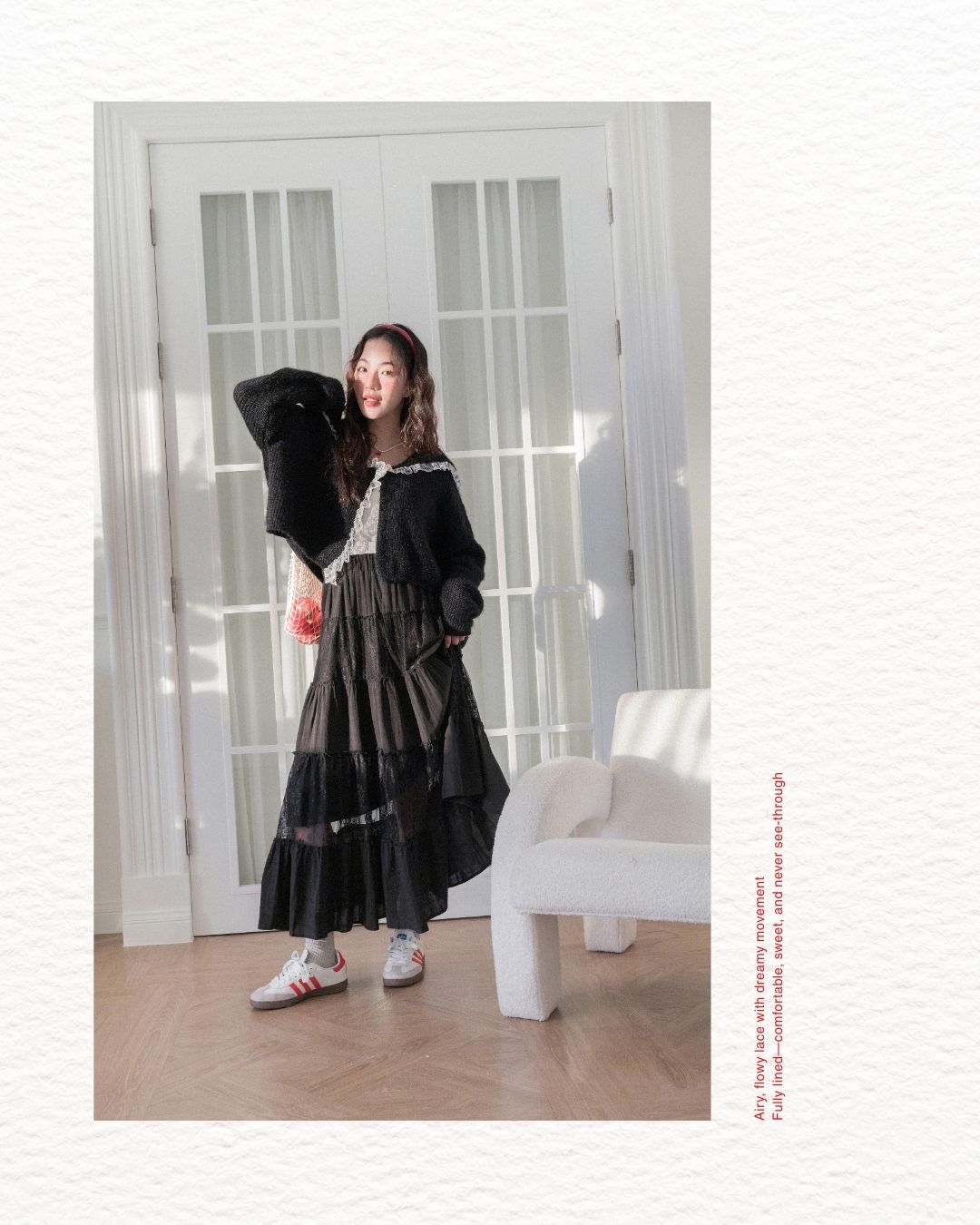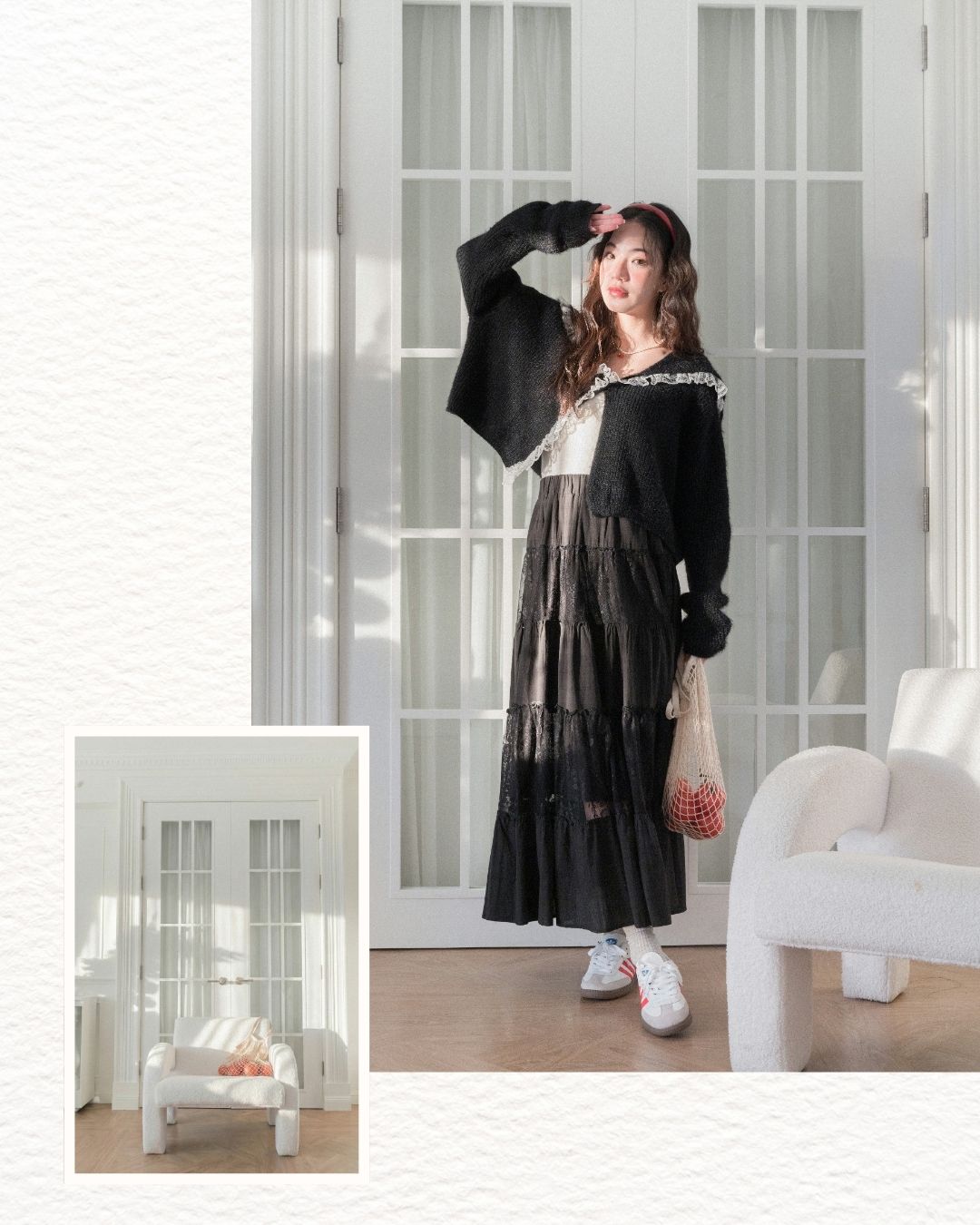 กระโปรง Maxi ตัดต่อผ้า cotton texture มีลวดลายในตัว ตัดต่อผ้าลูกไม้นิ่มๆ โทนเข้มที่มีความหรูและโรแมนติกในเวลาเดียวกัน ลูกไม้ลายละเอียด ฟูเบา มีมิติ ใส่แล้วดูสวยเพรียวและขาเรียวทรงเอวสูงเก็บส่วนเกินได้ดี ซับในสองชั้นไม่บาง ไม่โป๊ เอวยางยืดได้เยอะ เหมาะกับงานเย็น ดินเนอร์ หรือวันที่ต้องการลุคหวานแบบ grown-up