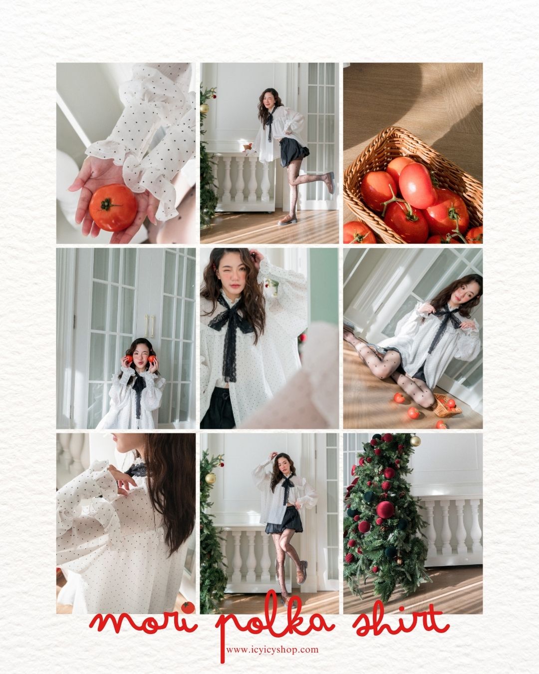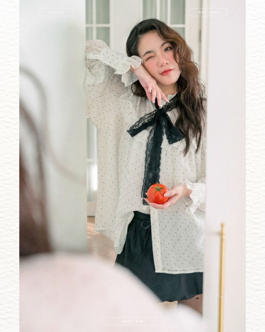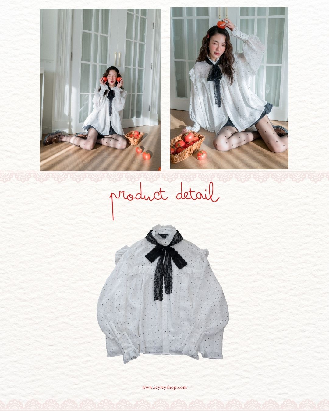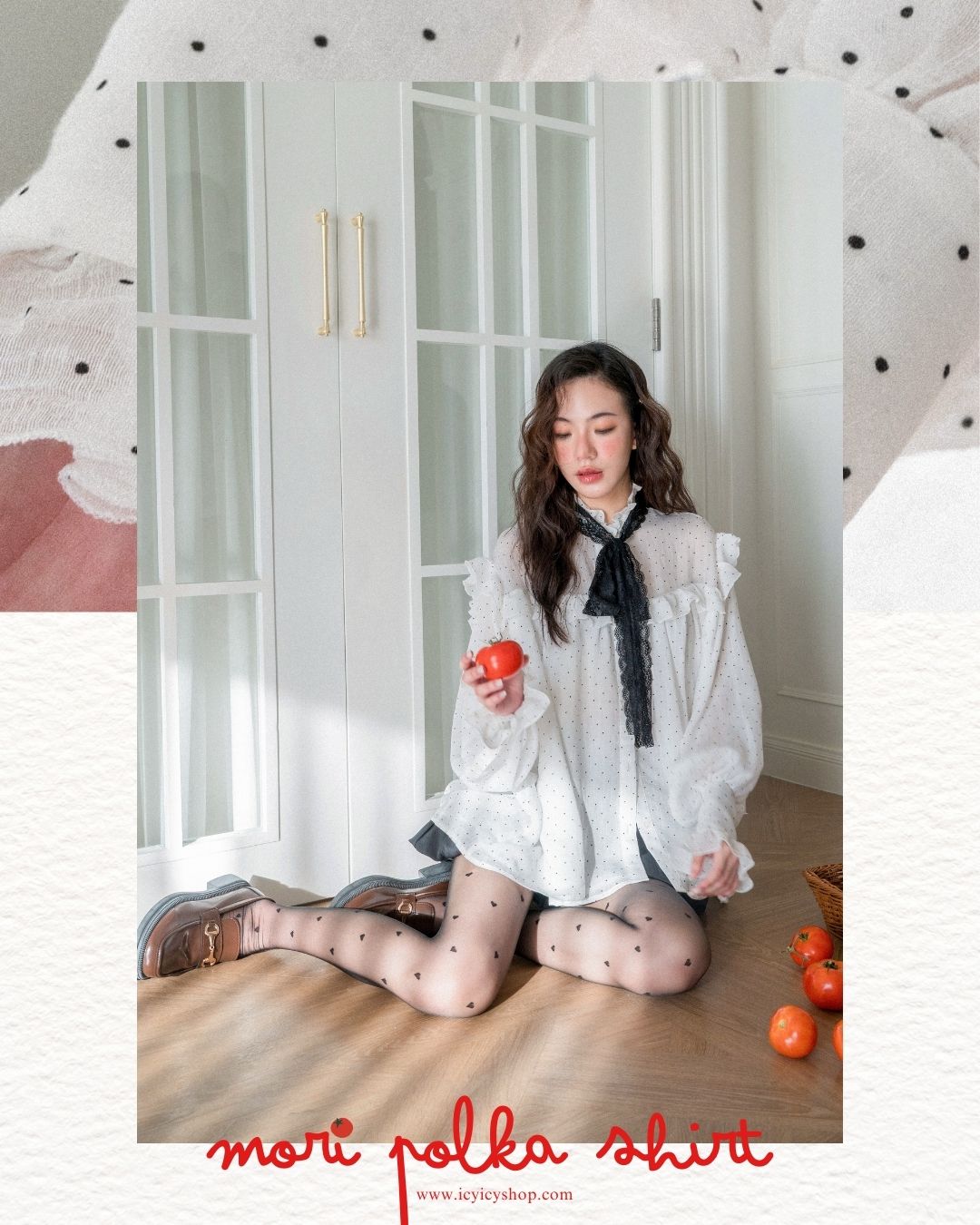เสื้อเชิ้ต Oversize แพทเทิร์นสุดฮ๊อตของ icyicy ผ้าลายจุดโทนหวาน ให้ลุคสดใสและหน้าไบรท์ทันทีที่ใส่ เนื้อผ้าออร์แกนิค นุ่มๆ ลื่นๆ มีซับในไม่บางเกินไป ใส่สบายทั้งวัน แมทช์ง่ายกับทุกลุค ดีไซน์คอปีนให้ลุคคุณหนู กระดุมหน้า แขนพองๆ น่ารักมาก ใส่แล้วดูสุภาพ ซ่อนความหวานลงตัว เหมาะกับทำงาน คาเฟ่ หรือวันสบายๆ แบบหวานละมุน *มีริบบิ้นลูกไม้ให้ 1 เส้น